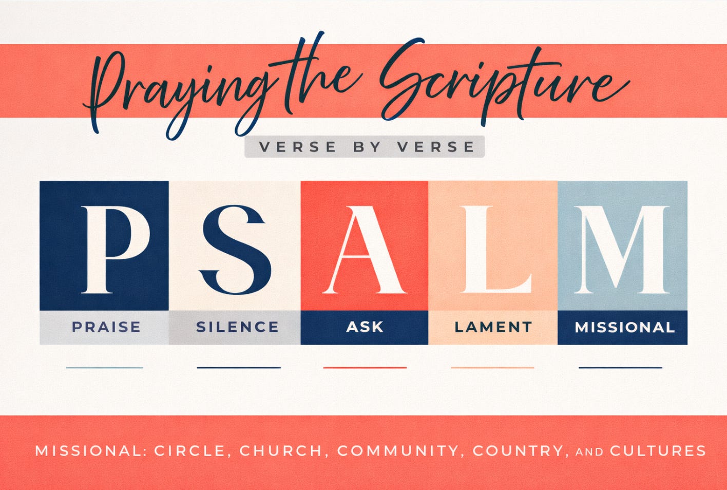Using the P.S.A.L.M. acronym as a pattern can create a deep, meaningful way to pray. When we pray God’s Word, it carries weight—because His Word is living and active (Hebrews 4:12).